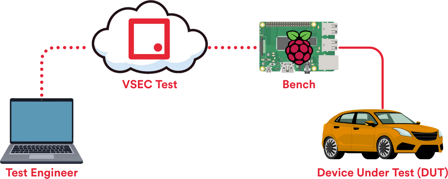 A bench is the computer which sits near the DUT and communicates with VSEC over the internet. The Bench is often connected to the DUT via a CAN, Ethernet, Wi-Fi or other interfaces. We offer images to setup a Raspberry Pi as a Bench through VSEC Test.